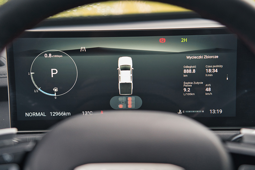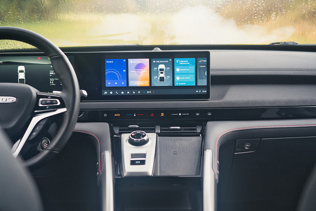 Centralny wyświetlacz multimedialny robi dobre wrażenie – jest czytelny, reaguje szybko i oferuje sporo opcji. Jednak nie obyło się bez irytujących detali. Najbardziej doskwiera schowanie w głębi menu ustawienia świateł. Nie ma fizycznego przełącznika – wszystko załatwia się w ekranie, co podczas dynamicznej jazdy może być uciążliwe.