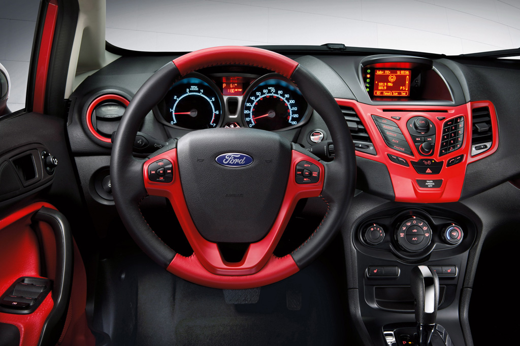 W Fieście kontrastowa biel lub czerwień zdobi centralną część deski rozdzielczej z przełącznikami, panele drzwiowe i wykończenia otworów wentylacyjnych. Dwukolorowa kierownica została obita skórą, natomiast gałka dźwigni zmiany biegów pozostała czarna.