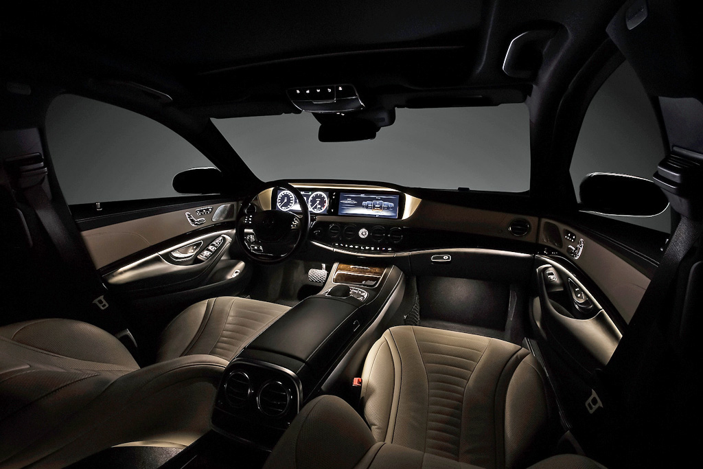 Szeroka deska rozdzielcza nowej klasy S teraz wydaje się jeszcze szersza dzięki nowemu designowi i podświetleniu, które jest oferowane w aż siedmiu różnych kolorach. Wydaje się też, że wszystkie materiały wykończeniowe – od skóry tapicerki począwszy, na tworzywie sztucznym skoczywszy – mają bardziej miękki, wręcz „pluszowy” wygląd. W kabinie zamontowano duże, 12-calowe wyświetlacze. Pasażerowie na tylnej kanapie będą mogli zastąpić swoje ekrany iPadami. Mercedes klasy S 2014 będzie także wyposażony w system audio marki Burmester o mocy 1500 W z 24 głośnikami, z których osiem zamontowano w podsufitce, by uzyskać efekt dźwięku przestrzennego.