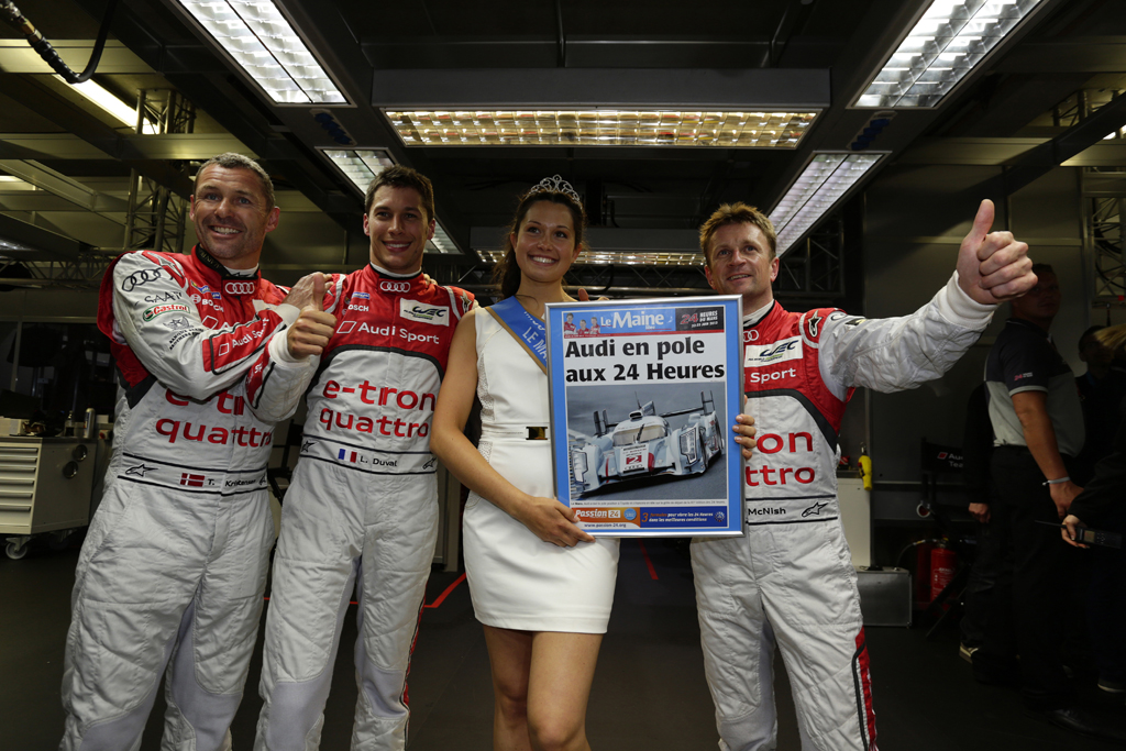 Inteligentna kombinacja mocy silnika TDI Power i układu napędowego quattro, dzięki której wyścigowa hybryda Audi w ubiegłym roku po raz pierwszy zwyciężyła w Le Mans sprawiła, że i tym razem, podczas dwóch dni kwalifikacji na torze o długości 13,629 km, cztery ringi zostawiły konkurentów daleko w tyle. Walkę o pole position numer jeden wygrała załoga Audi R18 e-tron quattro z numerem startowym „2“. Najlepszego czasu 3 minut i 22,349 sekund (242,5 km/h), jaki w środowy wieczór, już na początku pierwszej rundy kwalifikacji osiągnął Loïc Duval, nie udało się nikomu poprawić.