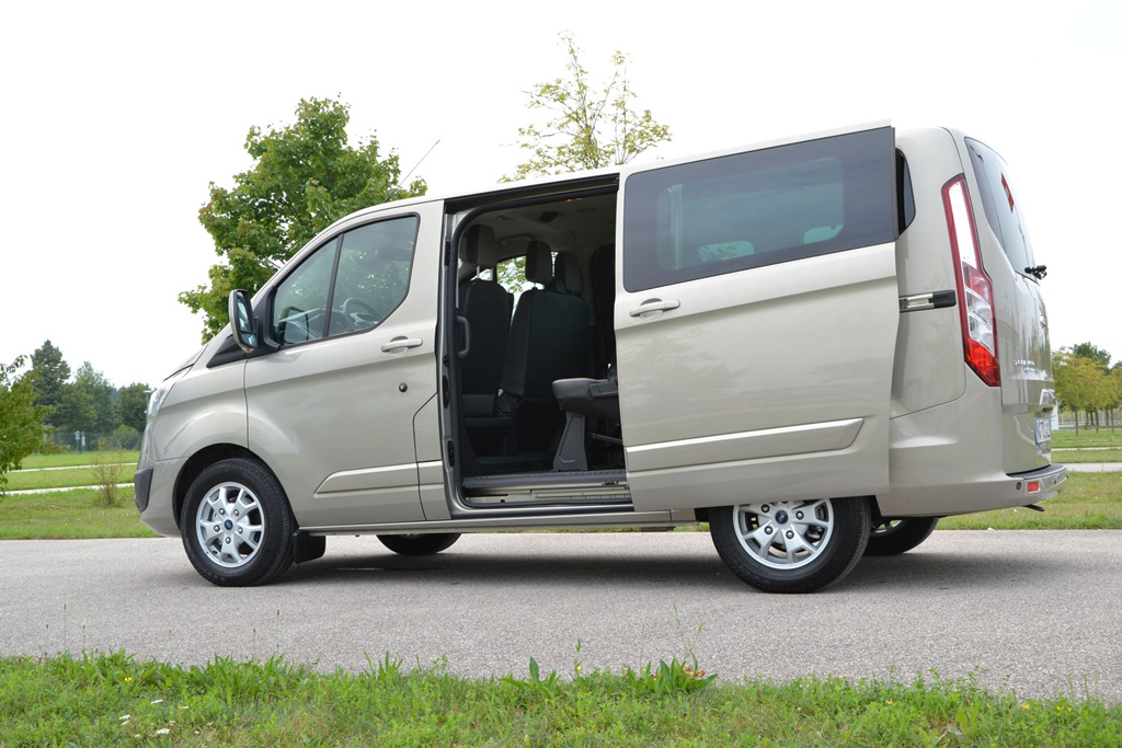 Ford Tourneo Custom posiada w standardzie parę przesuwanych drzwi oraz listwy progowe, które znacznie ułatwiają wsiadanie i stanowią wyrazisty element stylizacyjny. Dostęp do bagażnika odbywa się przy pomocy unoszonej ku górze klapie.
