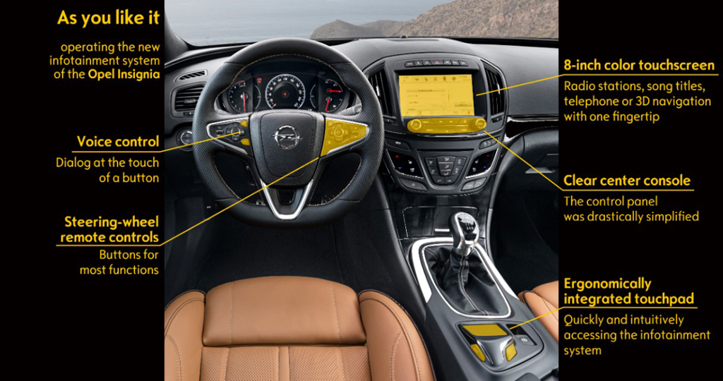 Podczas 65. Targów Motoryzacyjnych we Frankfurcie (12–22 września 2013 r.) odbędzie się premiera dwóch modeli Opla: Insignii i Insignii Country Tourer wyposażonych w nowy kokpit i system multimedialny najnowszej generacji. W trakcie udoskonalania tych elementów skoncentrowano się na następujących kryteriach: przejrzystej, prostej, a przez to intuicyjnej obsłudze; indywidualizacji oferty audio-informacyjnej oraz, oczywiście, wygodzie i bezpieczeństwie kierowcy i pasażerów. Komfort i bezpieczeństwo wszystkich podróżujących w samochodzie osób zapewniono poprzez minimalizację rozpraszania uwagi, które mogłoby uniemożliwić kierowcy skupienie się na sytuacji na drodze.