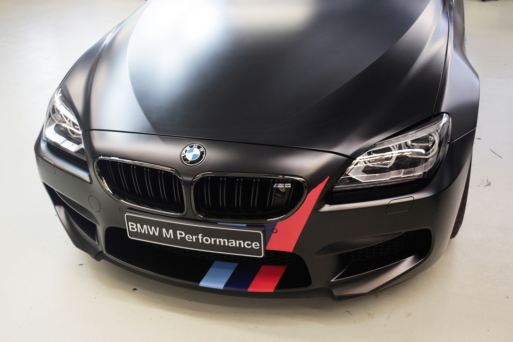 Wyjątkowy charakter tego pokrytego lakierem Frozen Black BMW M6 Gran Coupe podkreślają ostatecznie pasy BMW M Performance z przodu i z tyłu.