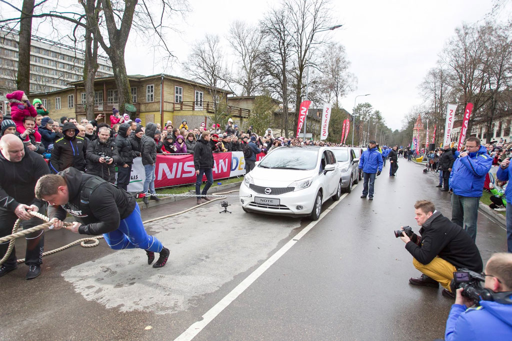 Zydrunas Savickas, najsilniejszy człowiek na świecie, ustanowił nowy rekord Guinnessa w kategorii „najwięcej samochodów ciągniętych przez jedną osobę”, holując 12 nowych Nissanów Note o łącznej masie 12 941 kg.