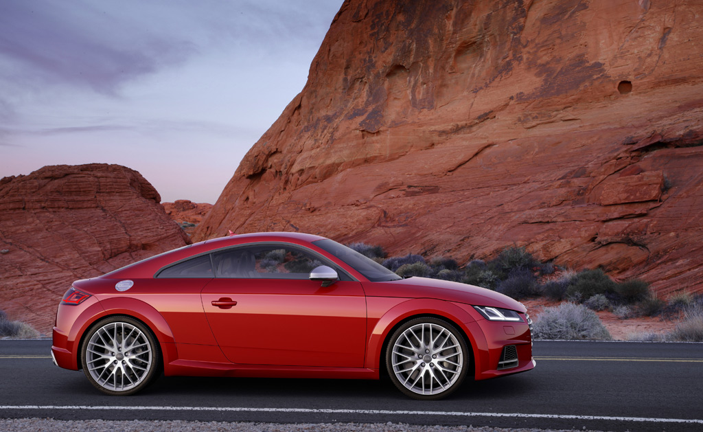 Profil nowych TT i TTS w wielu szczegółach przypomina należące już do klasyki stylistyki modele pierwszej generacji. Progi pojazdu są wyraźnie zarysowane, a szerokie wnęki kół wyglądają niczym oddzielne figury geometryczne. Przednie wnęki zachodzą na krawędź maski silnika, przechodzącą dalej w linię Tornado przebiegającą aż do tyłu pojazdu. Zespół okien bocznych również wydaje się stanowić osobną figurę geometryczną. Delikatne ścięcie u tyłu tylnego bocznego okna uwypukla słupek C. Klasyczną, bardzo charakterystyczną dla TT pokrywę wlewu paliwa otwiera się przez naciśnięcie. Pod nią nie ma korka – kierowca może włożyć końcówkę dystrybutora bezpośrednio do otworu wlewu.