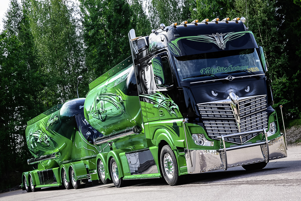 Ale tym razem nie mamy do czynienia z ciężarówką amerykańską, ale niemiecką – to trzyosiowy Actros 2551 6×2 z najmocniejszym silnikiem o pojemności 12,8 litra. Jego zabudowa – silos mieszczący 22 m3 ładunku – pochodzi z Finlandii, podobnie jak i właściciel, Mika Auvinen. To on odpowiada za kompletną metamorfozę pojazdu.