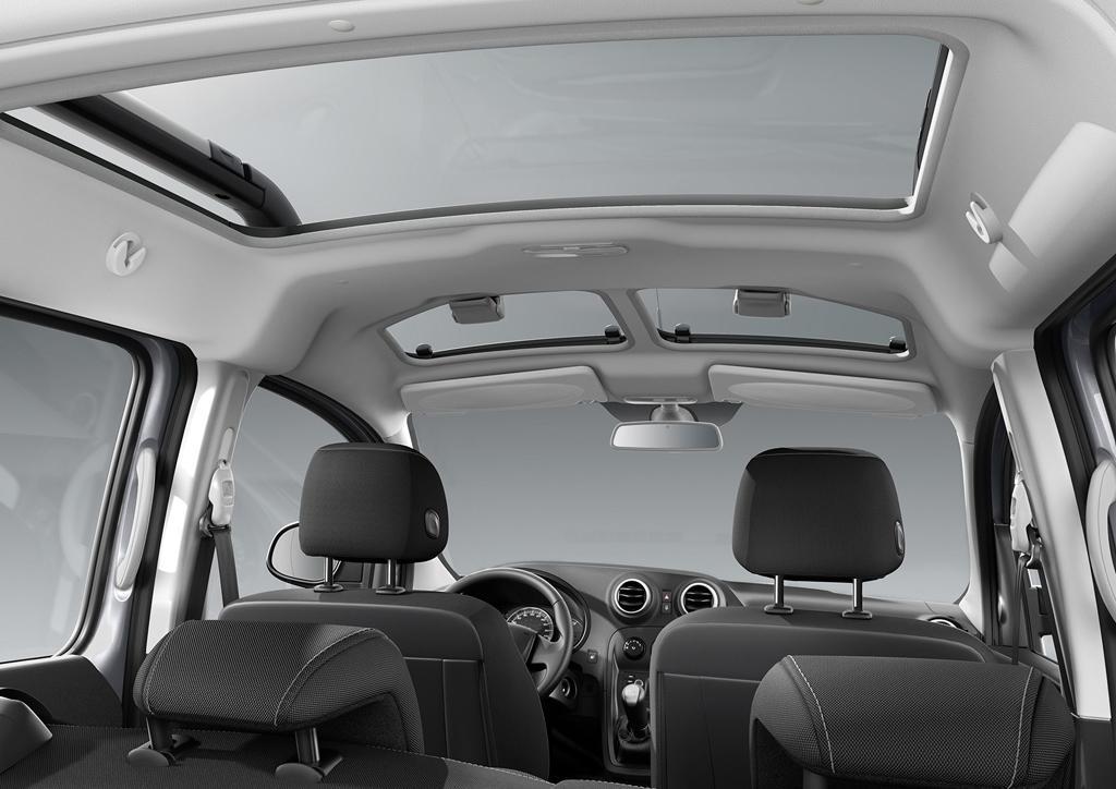 Nowe elementy opcjonalnego wyposażenia pozwalają na jeszcze dalej idącą indywidualizację Citana. Odmiany “długie” rejestrowane jako osobowe na życzenie dostępne są z dzielonym, ręcznie sterowanym oknem dachowym nad przednimi fotelami. Wykonano je z przyciemnionego szkła. Obie części można otwierać niezależnie, zgodnie z kierunkiem jazdy. Kolejną porcję światła wpuszcza do wnętrza nowy, zintegrowany szklany dach panoramiczny nad tylnymi siedzeniami.