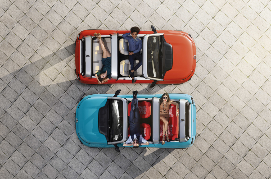 - Niepowtarzalna osobowość: z przodu przyjazny, charakterystyczny design, czerpiący z motywów stylistycznych, typowych dla współczesnego stylu Citroena. A do tego wiele możliwości personalizacji, m.in. cztery kolory nadwozia (niebieski, pomarańczowy, żółty i beżowy), dwa kolory dachu i dwa kolory siedzeń.