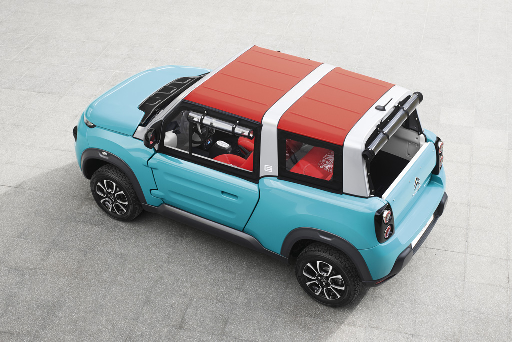 Wysoki prześwit Citroena E-MEHARI pozwala wjechać na każdą drogę. Wszechstronność i porywający wygląd sprawiają, że czuje się on pewnie zarówno w ekskluzywnych dzielnicach wielkiego miasta, jak i w najmodniejszych kurortach nadmorskich. Koncepcyjny Citroen E-MEHARI by Courreges uosabia ducha joie de vivre, łącząc piękno z użytecznością.