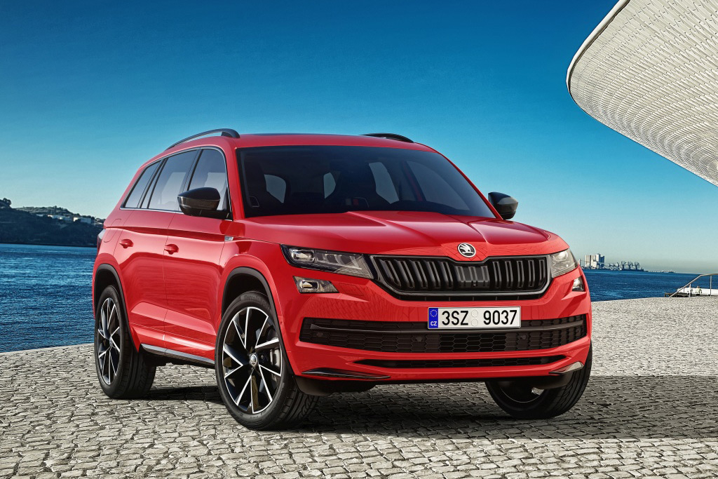 Sylwetkę modelu charakteryzują krótkie zwisy, opadająca linia dachowa optycznie przedłużona przez słupek D i podcięty tył. Ochronne listwy boczne w modelu KODIAQ SPORTLINE wykończone są w kolorze nadwozia. Standardowo zakładane są tu dziewiętnastocalowe obręcze ze stopów metali lekkich o nowym wzorze, opcjonalnie dostępne są obręcze w rozmiarze nawet dwudziestu cali. O wyjątkowości tej wersji dyskretnie informują oznaczenia modelu zamontowane za przednimi kołami.