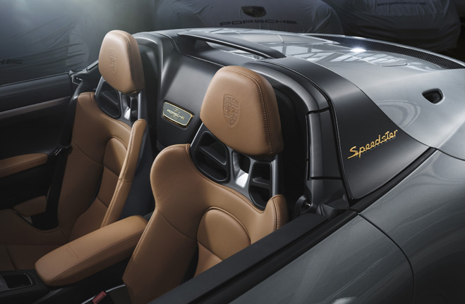 Zagłówki, karbonowe osłony progów drzwi i tarczę umieszczonego pośrodku obrotomierza zdobi logo „Speedster”. Wszystkie wskaźniki mają białe wskazówki oraz czarne tarcze z zielonymi oznaczeniami – co stanowi nawiązanie do słynnego przodka, Porsche 356 Speedster. Na zabudowie za fotelami znalazła się plakietka limitowanej edycji wraz z numerem seryjnym danego egzemplarza 911 Speedster – łącznie model powstanie w liczbie 1948 sztuk.