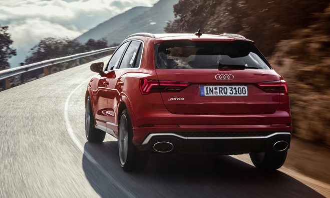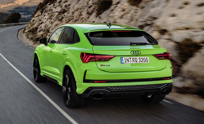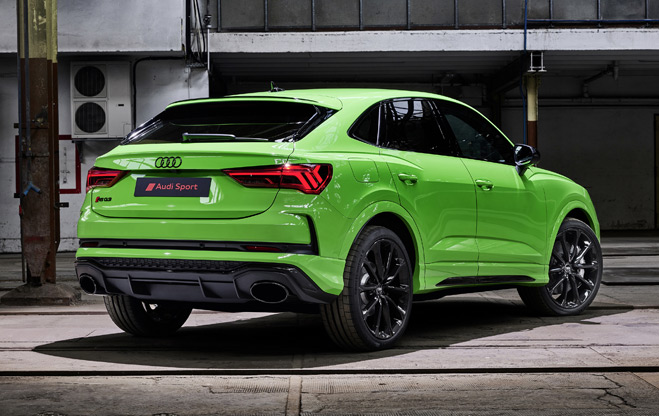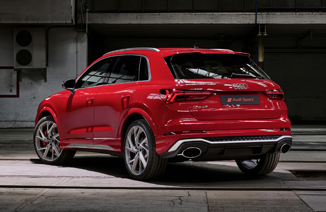 Stylistyka tyłu pojazdu jest również imponująca. Nisko umieszczona tylna szyba i spojler na skraju dachu ponad nią sprawiają, że RS Q3 Sportback wydaje się być szersze niż RS Q3. Nisko zawieszona linia dachu kończy się masywnymi, płaskimi i pochyłymi słupkami D. Charakterystyczny dla modeli typu RS długi spojler na skraju dachu RS Q3 podkreśla możliwości wysokowydajnego SUV’a i zapewnia większą siłę docisku. Nowa generacja RS Q3 po raz pierwszy wyposażona jest w podwójny układ wydechowy RS z dużymi, chromowanymi końcówkami umieszczonymi po obu stronach. Całość wkomponowana jest w tylny zderzak RS z dyfuzorem i z poziomymi, błyszczącymi czernią nakładkami. Dyfuzor i nakładki opcjonalnie dostępne są w kolorze matowego aluminium.