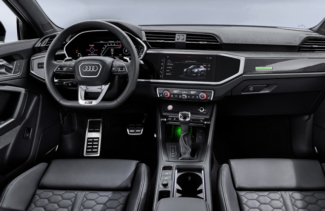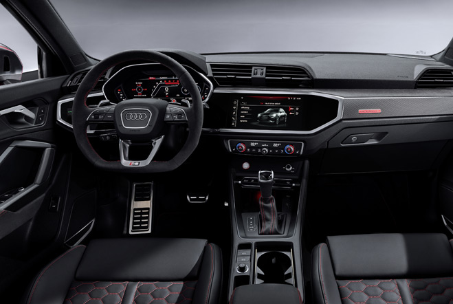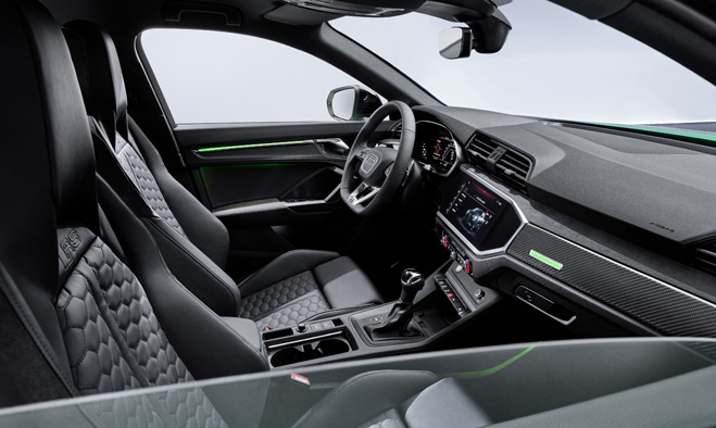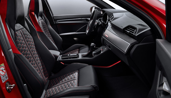 Sportowe fotele obite czarną skórą i Alcantarą z przetłoczeniami RS, wyrażają atletyczny charakter Audi RS Q3 i RS Q3 Sportback. Fotele RS sport obite skórą Finenappa z charakterystycznymi przeszyciami RS w kształcie plastra miodu i ze zintegrowanymi zagłówkami, są po raz pierwszy dostępne w całej rodzinie modelowej Q3. Ich kontrastowe przeszycia standardowo są czarne, opcjonalnie czerwone lub niebieskie. Wybierając jeden z dwóch pakietów stylistycznych RS, elementy na kierownicy, na pasach bezpieczeństwa, wykładzinie podłogowej i dźwigni zmiany biegów są kolorowe, a sama kierownica i dźwignia zmiany biegów obite są Alcantarą. W powiększonych pakietach stylistycznych RS tapicerka drzwi i podłokietniki w drzwiach obite są czerwoną lub niebieską Alcantarą. Wstawki w kolorze Aluminium Race, w kolorze antracytowym i opcjonalnie w kolorze czerni fortepianowej lub karbonu, dopełniają stylistyki wnętrza. Po raz pierwszy można też zamówić całe wnętrze w kolorze czarnym.
