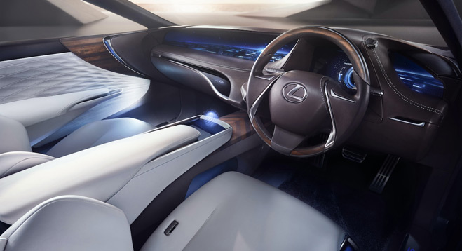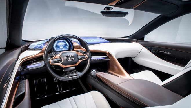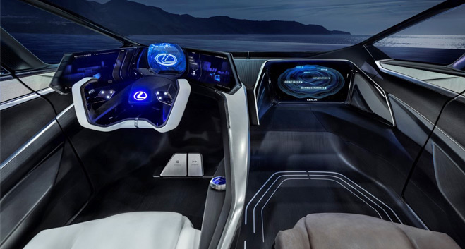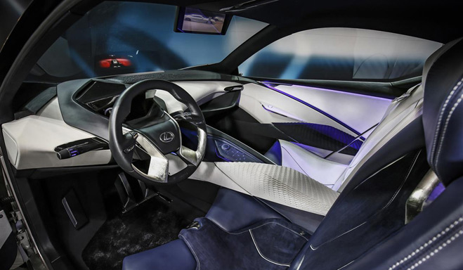 We wnętrzu koncepcyjnego Lexusa znalazły się cztery miejsca, o raczej nietypowym układzie. Fotel kierowcy jest nieruchomy, natomiast regulować można ustawienie kierownicy i pedałów. Na dostęp do tylnych miejsc pozwala przesuwany fotel pasażera z przodu. W ten sposób projektanci podkreślili priorytet miejsca kierowcy. Taki charakter dodatkowo wzmocnił projekt stylistyczny wnętrza, symbolicznie dzielący przestrzeń na dwie strefy – kierowcy i pasażerów. W miejscu zegarów znajdziemy ponadto cyfrowy wyświetlacz, stylizowany na ekran holograficzny. A tradycyjną konsolę środkową zastąpił szerokokątny wyświetlacz projekcyjny, umieszczony pośrodku podstawy przedniej szyby.