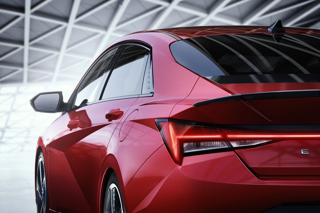 Profil Elantry N Line przechodzi w wyrzeźbiony tył, zaprojektowany w celu poprawy aerodynamiki i zaakcentowania niskiej i szerokiej sylwetki, dodatkowo podkreślonej poprzez poziome linie. Zintegrowany spojler, chromowane końcówki wydechu i tylny dyfuzor N Line również otrzymały sportowy styl.