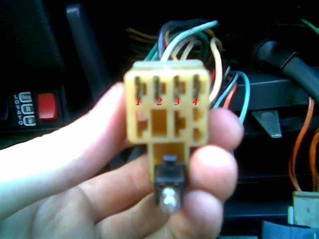 Teraz metodą prób i błędów odnalazłem + (2) oraz odpowiednie kabelki od świateł mijania (1) oraz postojowych (3). Teraz szukamy w kostce od przekaźnika kabelka kolorystycznie pasującego tego z kostki przełącznika od świateł postojowych (kabelek żółto-czerwony).