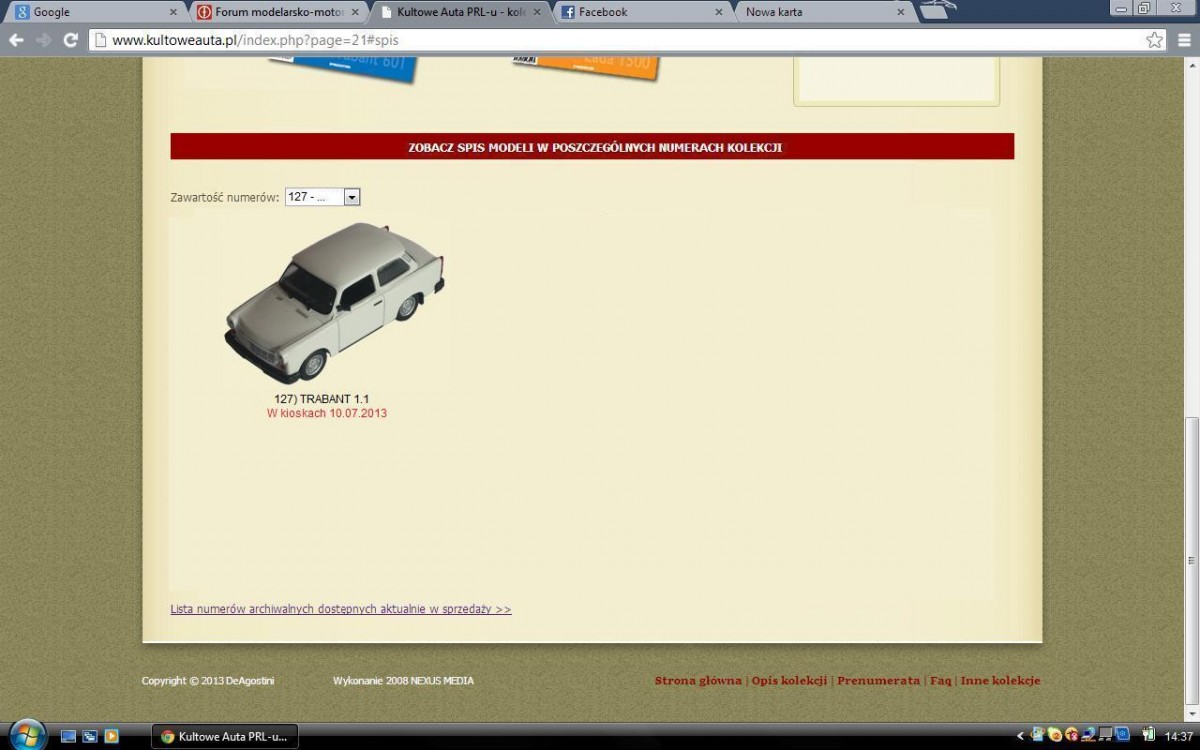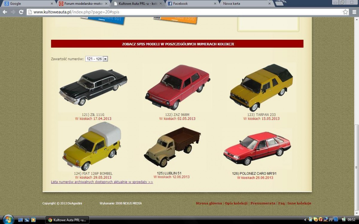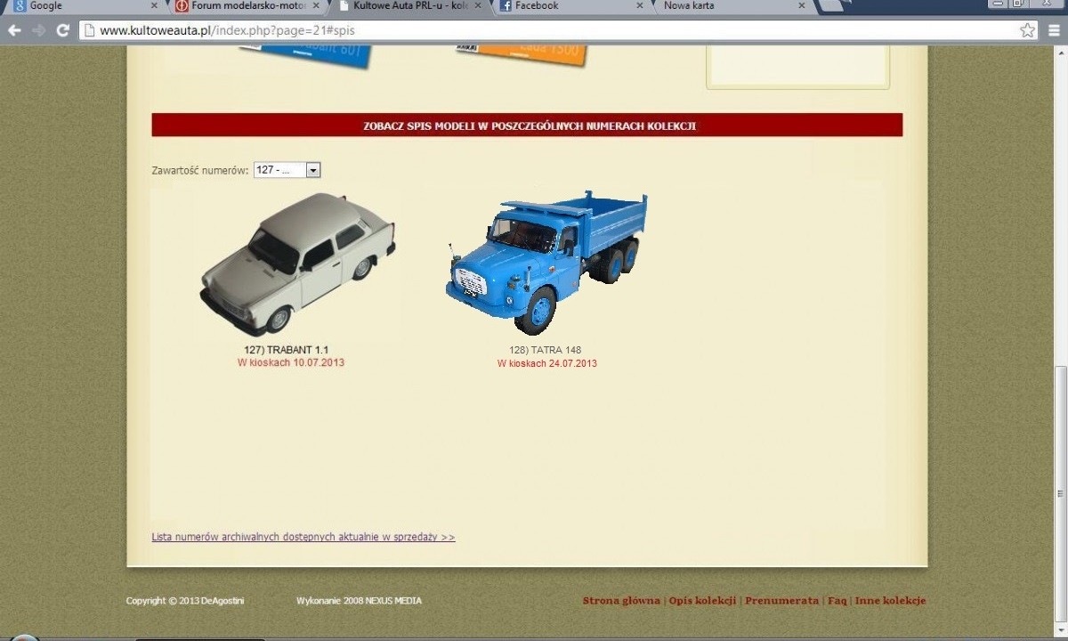 simon2107 Kia Ceed 1.4 Optimum ... Olsztyn/Górowo Iławeckie | 2013-04-01 16:18:11 To, że czeka nas aktualizacja to pewne-jeszcze godzine temu nie było dat wydania przy numerach 121-124 a teraz juz są-czyli ktoś sie bawi na stronie. Co do zapowiedzi lublina i poloneza caro to niestety żart primaaprilisowy-wystarczy spojrzec na modele. Natomiast trabant byl już zapowiadany i pojawil sie już kiedyś na stronie DeA, więc może się rzeczywiście wkrótce ukazać. |